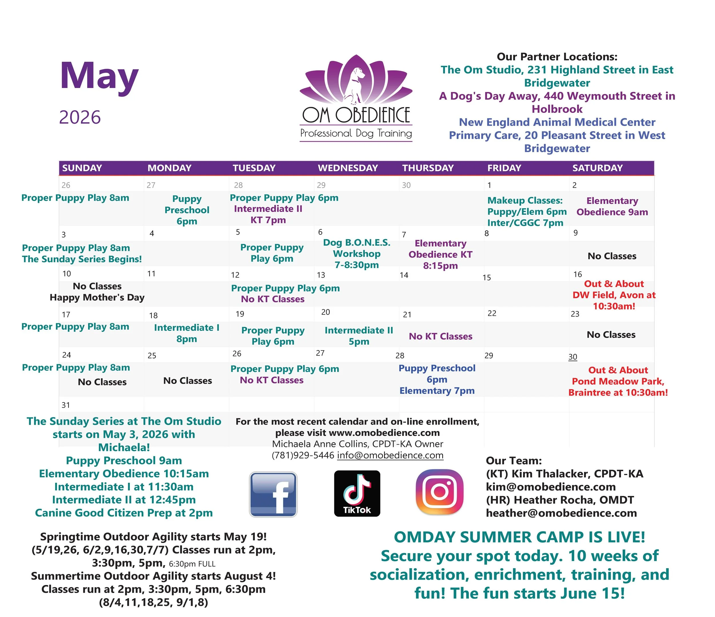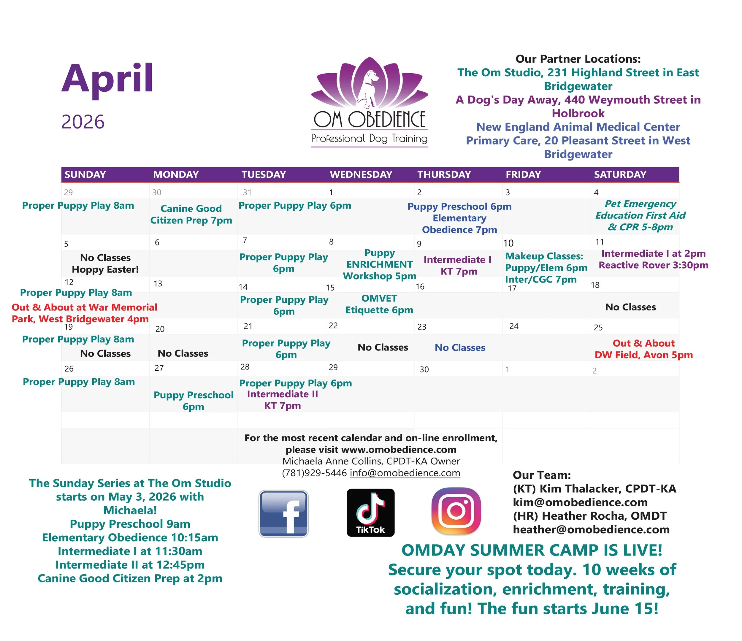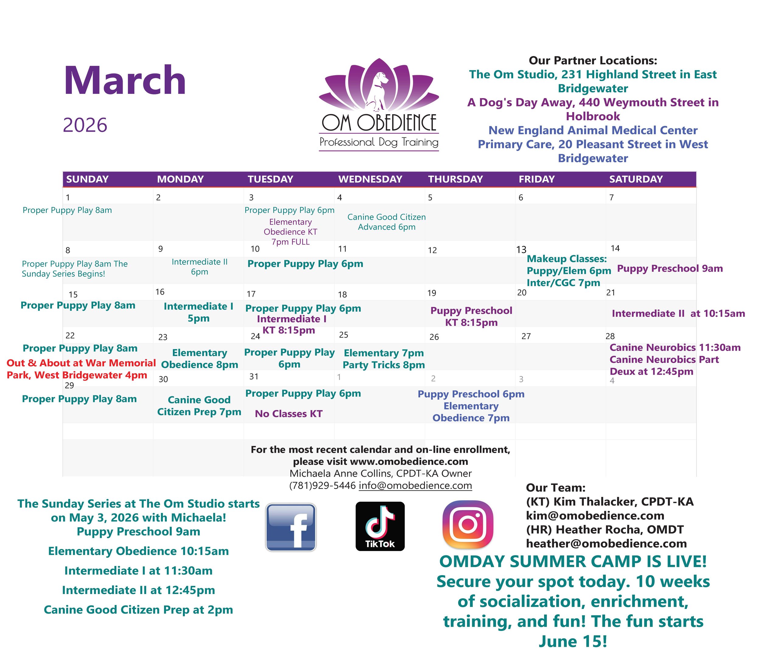 This calendar shows the start date, time and locations for each course. It is color coded by location. For example, if a purple class begins on a Tuesday at 7 pm, it will meet for the 6 week duration on Tuesday's at 7 pm at A Dog's Day Away (400 Weymouth Street, Holbrook). There are no classes held at our West Bridgewater address. It is a mailing address only. WE RENT SPACE AT OUR PARTNER LOCATIONS.