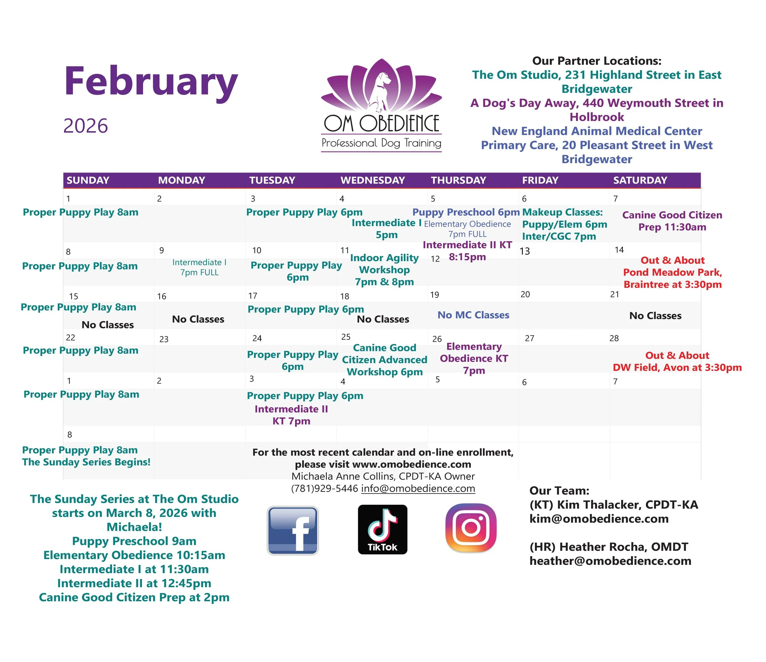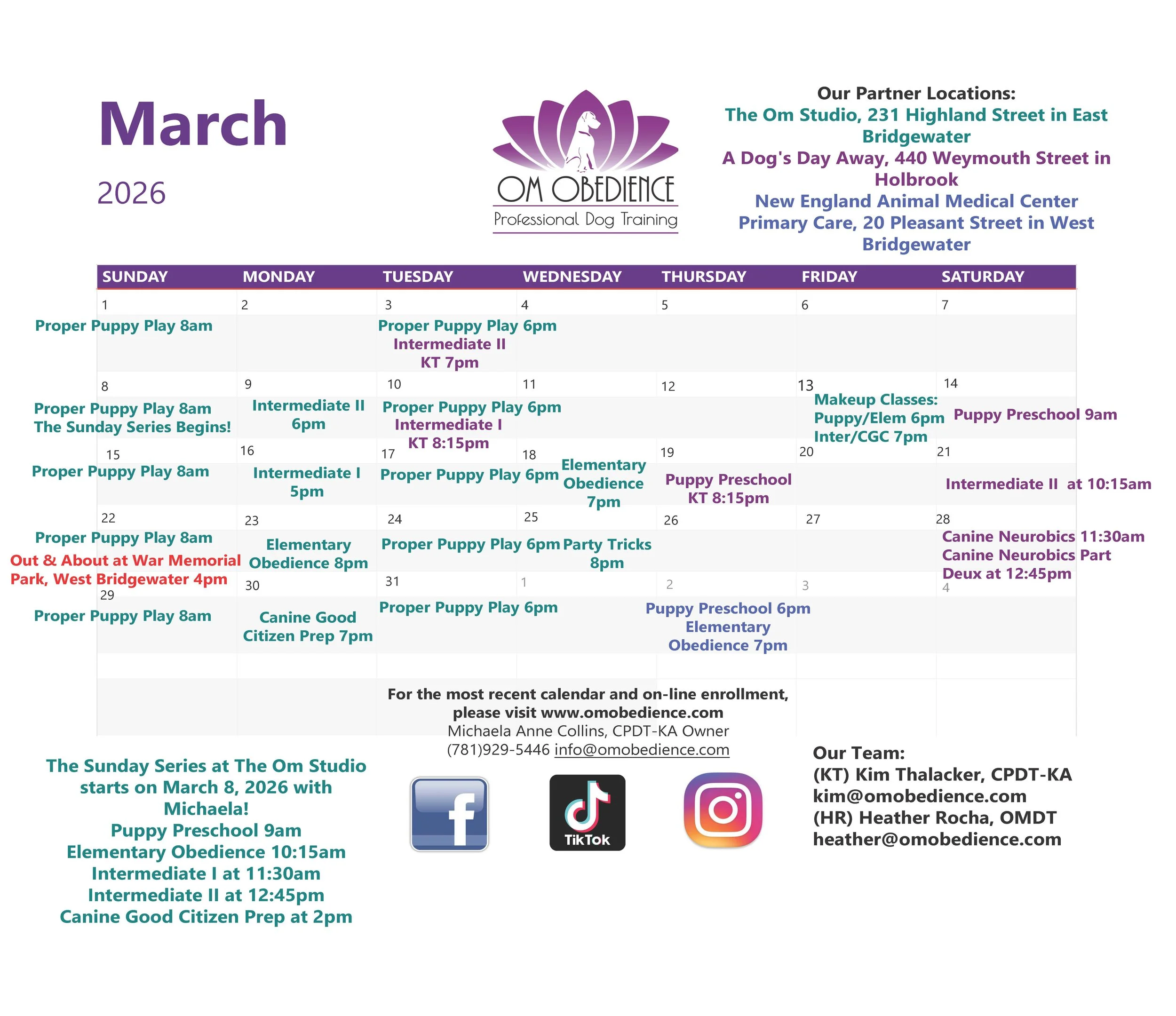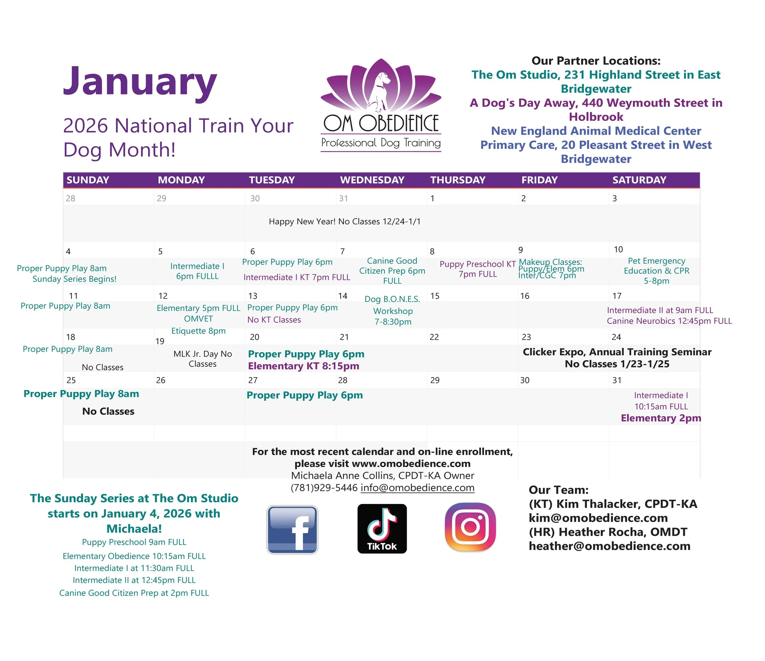 These are the start date, times and locations for each course. They are color coded by location. WE RENT SPACE AT OUR PARTNER LOCATIONS. For example, if a purple class begins on a Tuesday at 7 pm, it will meet for the 6 week duration on Tuesday's at 7 pm at A Dog's Day Away (400 Weymouth Street, Holbrook). There are no classes held at our West Bridgewater address. It is a mailing address only.